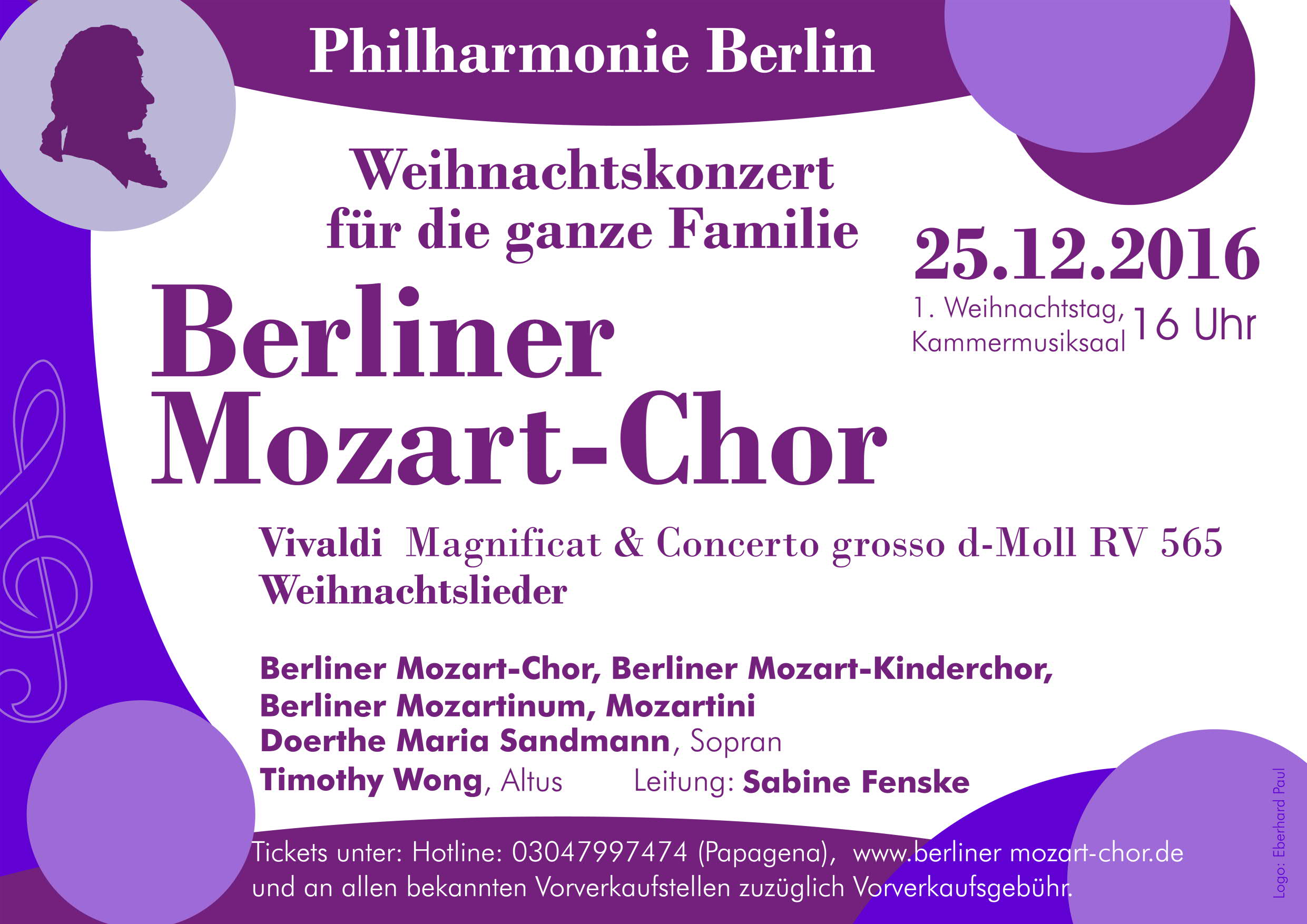 Am Sonntag, den 25.12.2016, singen wir wir immer um 16:00 Uhr unser großes Weihnachtskonzert im Kammermusiksaal der Philharmonie.