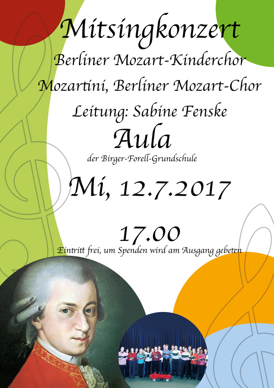Am Mittwoch, den 12.07.2017 veranstalten wir um 17:00 Uhr ein Konzert zum Mitsingen in der Aula der Birger-Forell-Grundschule in der Koblenzer Straße 24 in 10715 Berlin.