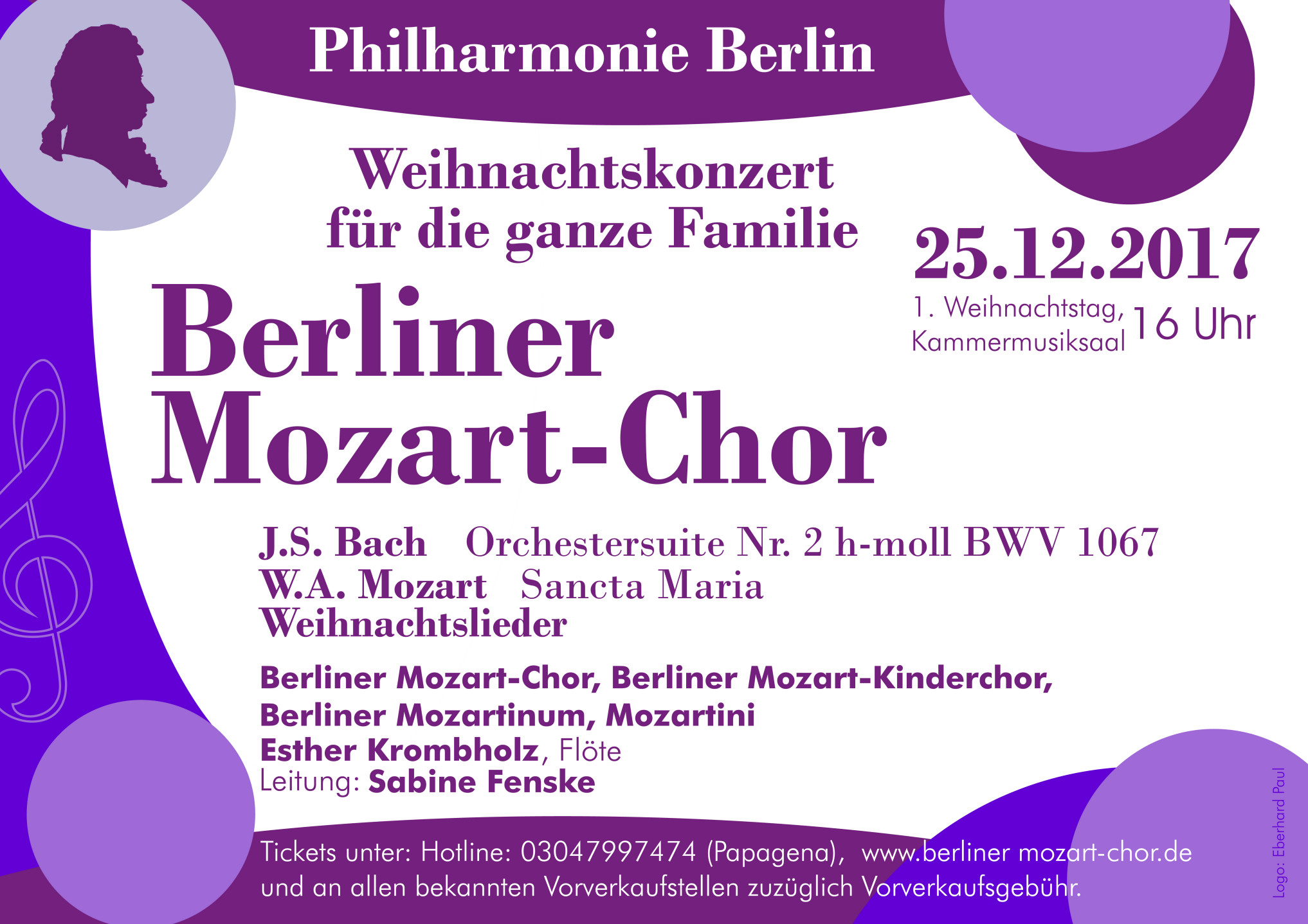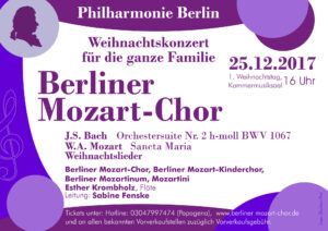 Am Montag, den 25.12.2017, singen wir wir immer um 16:00 Uhr unser großes Weihnachtskonzert im Kammermusiksaal der Philharmonie. Auf dem Programm stehen Weihnachtslieder sowie Bachs Orchestersuite Nr. 2 h-moll.